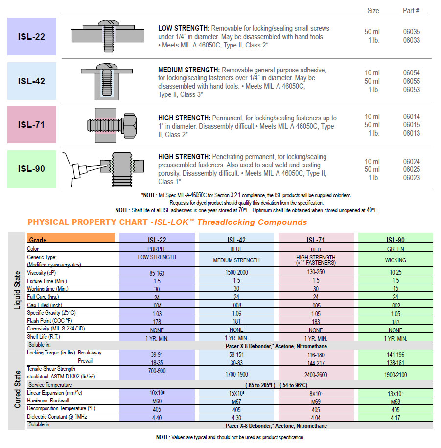 Pacer ISL™ Threadlocking Compounds are patented technology, structural cyanoacrylates that offer the strength and durability of anaerobics, and the cure times of an instant adhesive. This chemistry is NOT a metal reactive system. Unlike anaerobics, these materials will perform well on platings, stainless steel, and even plastic fasteners without the use of surface activators. • Use on any type of components, including metal, plated parts, plastic, wood, etc., for thread locking, sealing, joining, fastening and retaining. • Will not craze most plastics. • Non-surface sensitive. • Can be pre-applied. • Can be handled in 1-5 minutes • 80% of full strength in 15-30 minutes. NOTE: ISL® compounds are not recommended for applications involving constant immersion in water or constant exposure to temperatures over 180ºF. |