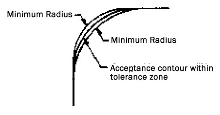 A toleranced radius with an unlocated center creates a tolerance zone defined by arcs tangent to adjacent surfaces within which the part contour must have a faired curve without reversals. The part contour falls entirely within the zone between the minimum radius and the maximum radius, regardless of the actual shape of the part. The radius at all points of the part contour shall neither be smaller than the specified minimum limit nor larger than the maximum limit. See illustration.