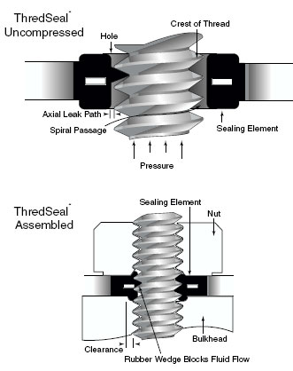 Thread seals have been designed to seal the threads of machine screws, studs, and similar items. They are made in one piece, the rubber sealing element being molded into the metal retainer. They utilize the principle of controlled confinement of the elastomer, permitting metal-to-metal contact of faying surfaces.